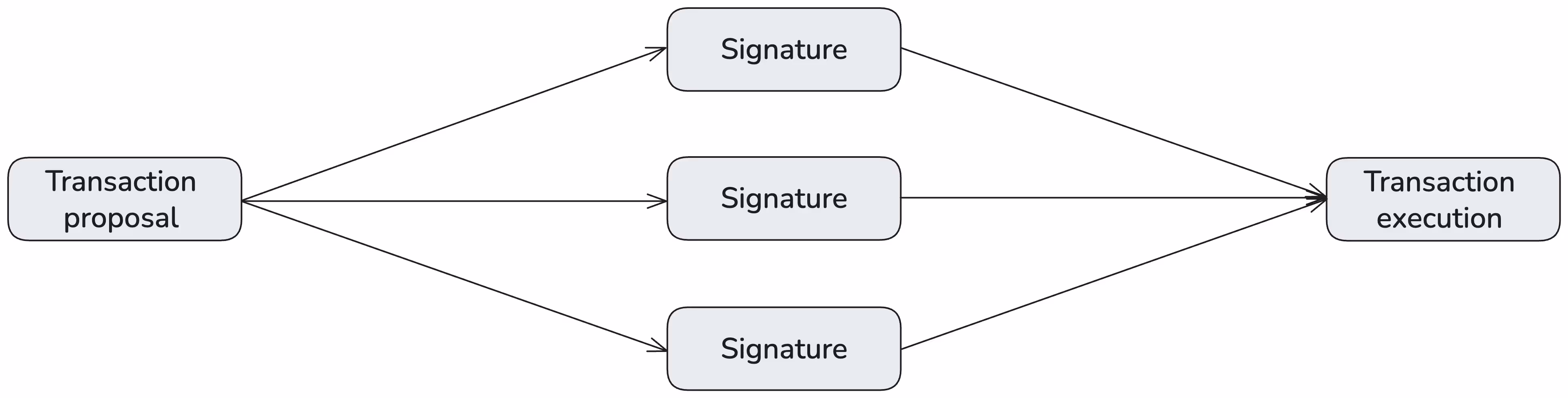 Public multisig flows follow a simple sequence: a transaction is proposed, cosigners sign, and, once a threshold is met, the transaction is executed onchain.