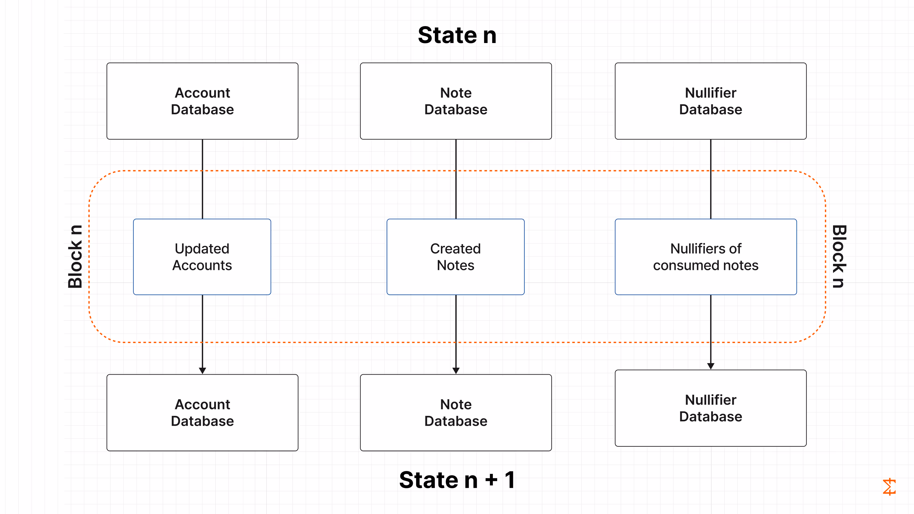 Block production with only part of the state is possible with Miden’s concurrent state model. A block contains the newly created notes and nullifiers. Notes are simply appended to the Notes Database. For nullifiers, the operator needs to update a Merkle tree, which, as mentioned, requires knowledge of the full tree.