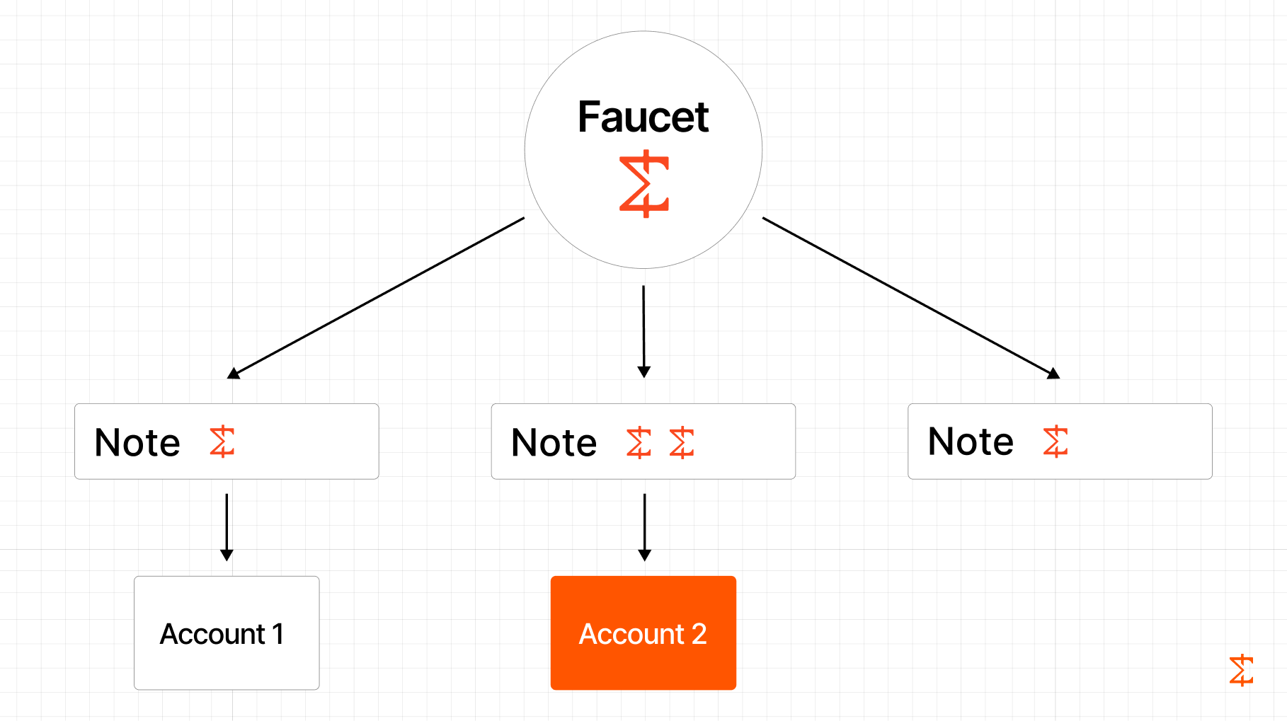 The difference is that faucets do not track ownership. Instead, they produce notes in executing transactions to distribute the assets. As described in Miden’s transaction model, those notes carry the newly created assets to be consumed by other accounts. That way, one can mint a million NFTs locally in a single transaction and then send them out, as needed, in separate transactions in the future. If executed privately, the network would lose track of asset ownership from then on; one cannot query the asset account to get a balance.