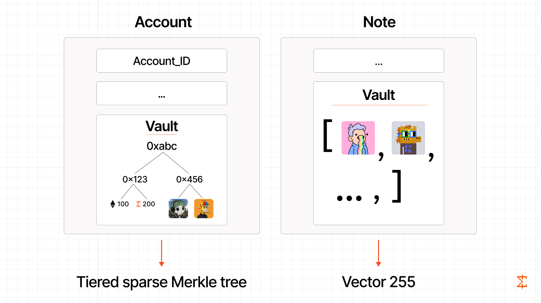 On Miden, all assets are stored in the owner’s account itself or in a note. Accounts and notes have vaults to store them. Accounts may store an unlimited number of assets in a tiered sparse Merkle tree. Notes store assets in vectors of length 255.