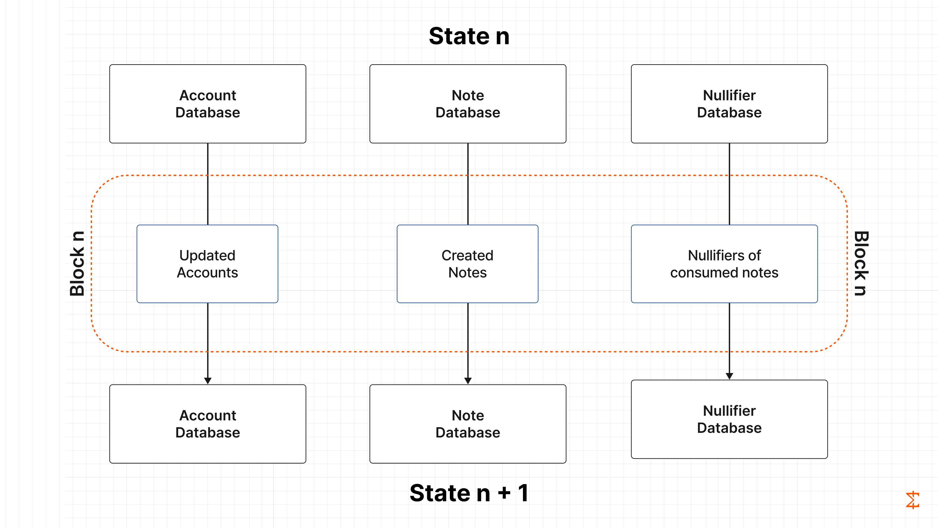 Block production with only part of the state is possible with Miden’s concurrent state model. A block contains the newly created notes and nullifiers. Notes are simply appended to the Notes Database. For nullifiers, the operator needs to update a Merkle tree, which, as mentioned, requires knowledge of the full tree.